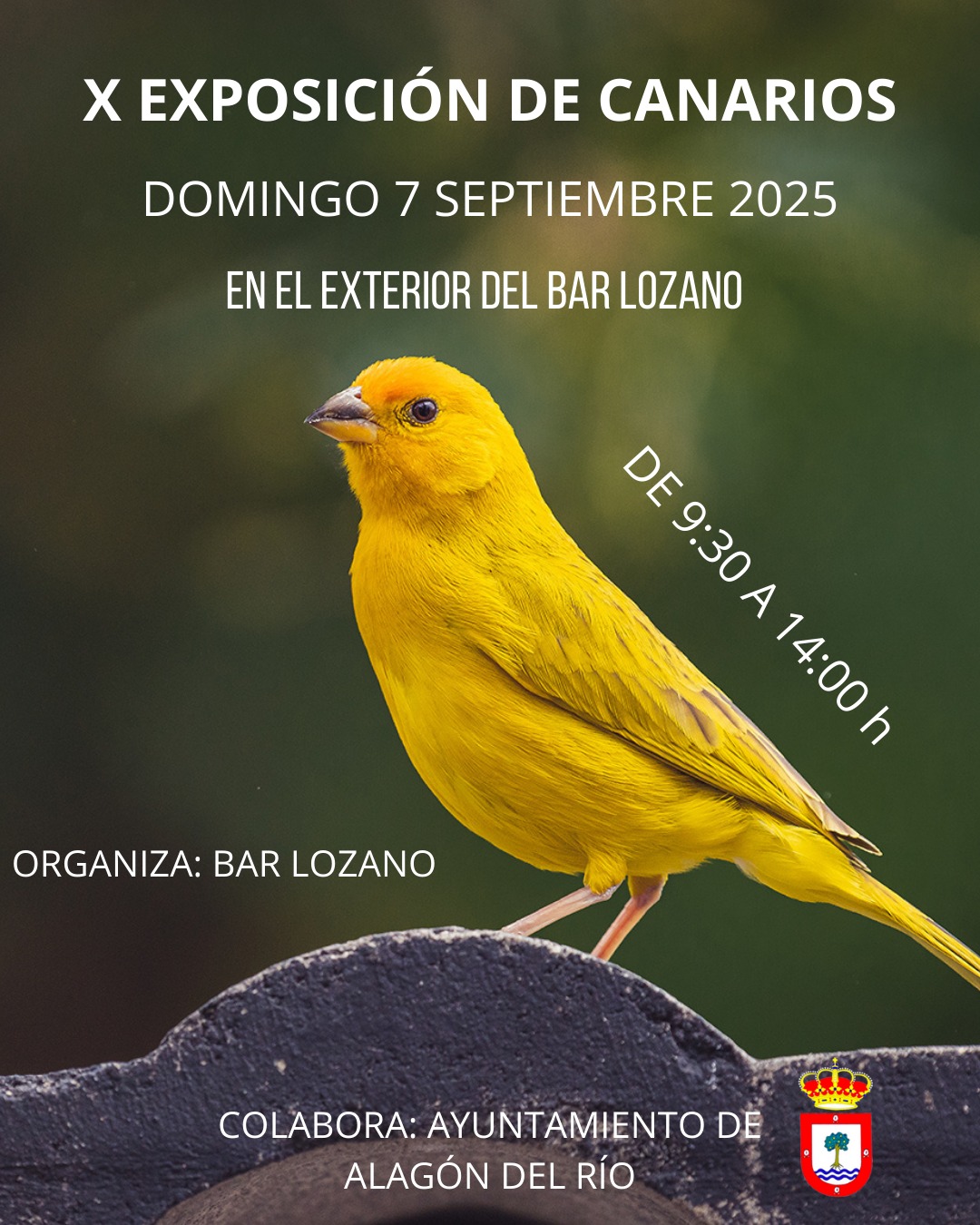 X EXPOSICIÓN DE CANARIOS. 05 septiembre 2025 Domingo 7 de Septiembre, de 9:30 a 14:00 horas, en el exterior del "Bar Lozano". Organiza "Bar Lozano". Colabora: Ayuntamiento De Alagón del Río. #SemanaCulturalyDeportivaAlagónDelRío2025 #FiestasDelCristo2025_AlagónDelRío